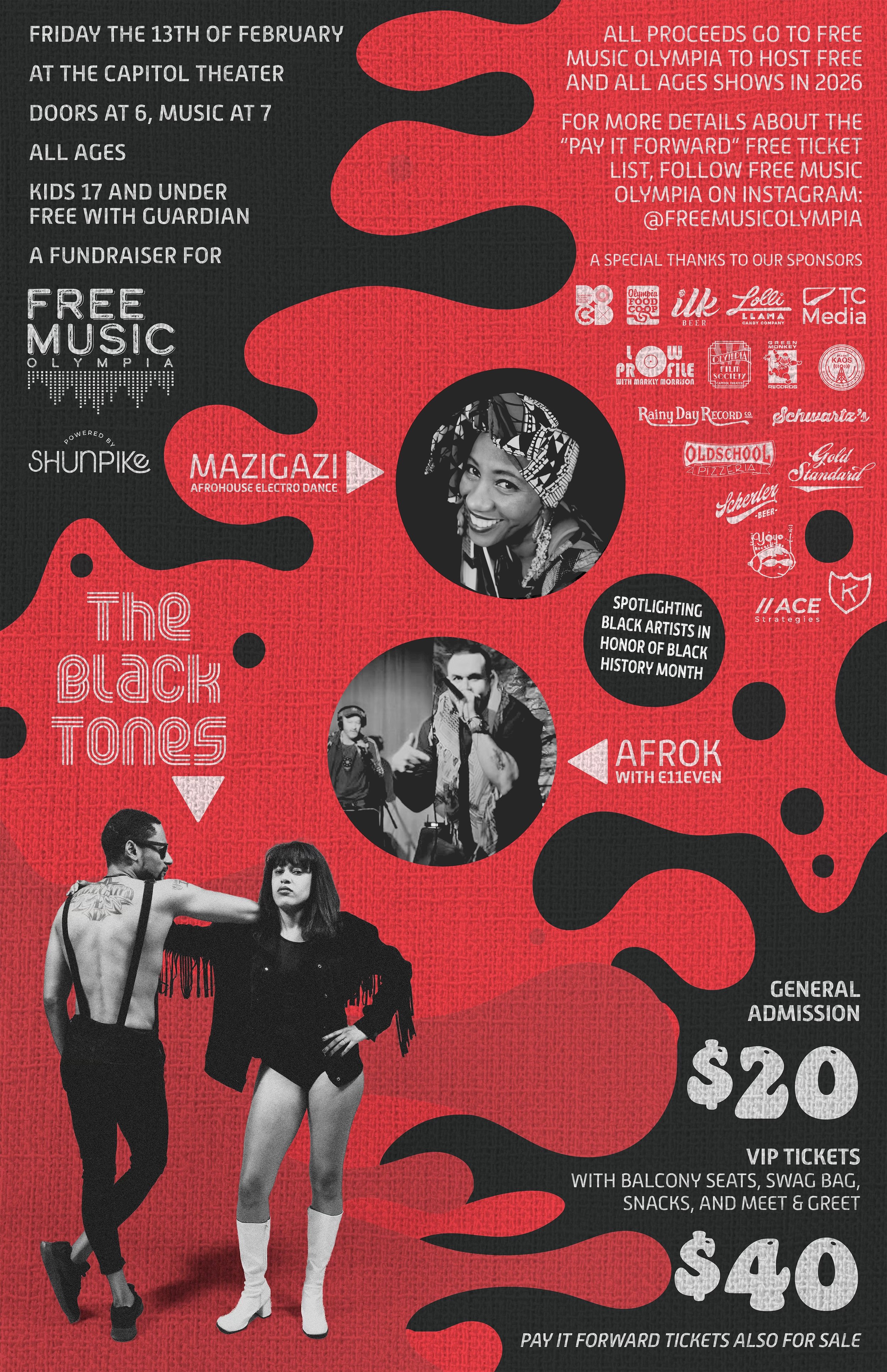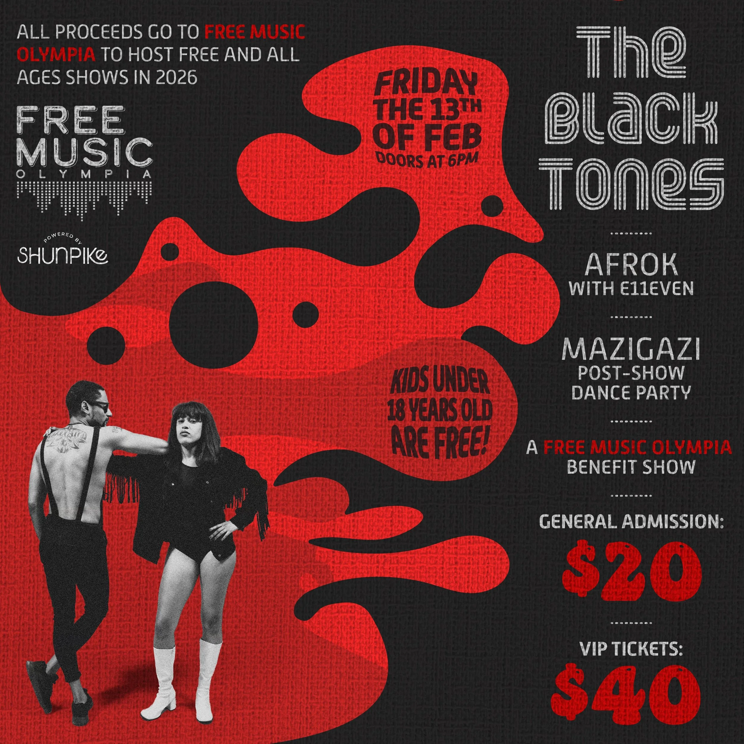Free Music Olympia is holding our first fundraising concert event to help our organization continue to provide free community concerts in 2026. Featuring performances by the Black Tones, Afrok with E11even and Mazigazi, it promises to be a fun, memorable evening.